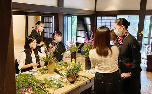 体験プログラムには客室乗務員の“おもてなしの心”が活かされており、都会ではなかなか触れることができない自然の草花を実際に手に取って行う「里山フラワーアレンジメント体験」では、初めての方でも簡単にアレンジできるよう、体験者が利用する手順書の作成にもこだわっています。また、自然に囲まれて行うリフレッシュプログラムには、客室乗務員が健康的に乗務に臨むための取り組みを活かしており、どのプログラムにも“おもてなしの心”と、この地域だからこその魅力を感じていただけるものとなっています。体験されたお客さまの声をもとに、小松市大杉町の里山の良さを体感していただけるよう、造成プログラムを磨き、継続的に小松市の観光需要創出に取り組んでいます。