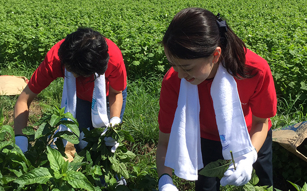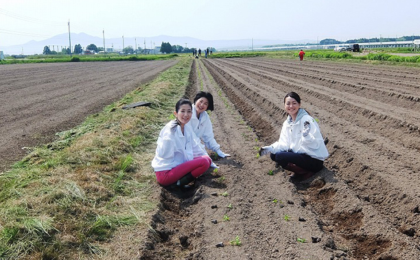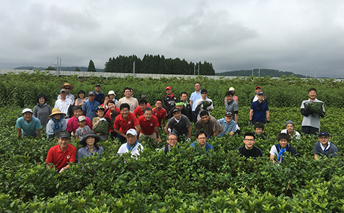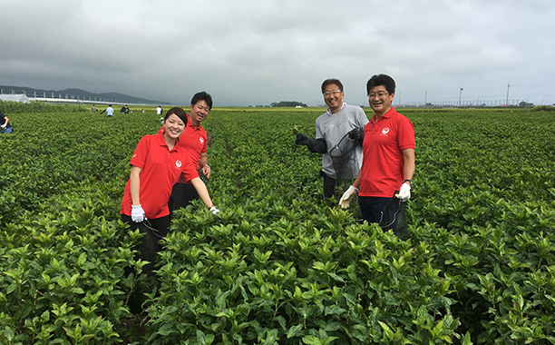 東北復興を応援するJALは、6次産業化による地域経済の活性化や伝統産業の復興に取り組む「あおもり藍」事業の応援プロジェクトを2016年3月から開始。食材としても優れた効能がある「あおもり藍」を練りこんで焼き上げた菓子「あおもり藍フィナンシェ」の機内サービス(茶菓提供)や、「あおもり藍」を使用したJALオリジナル商品の開発・販売を実施し、「あおもり藍」のプロモーションを展開。JAL青森支店を中心に、JALグループスタッフによる苗植えや収穫のお手伝いなど、地域資源を育て、磨き、国内外に広めることで「あおもり藍」産業の復興に向けた継続的な活動を行っています。