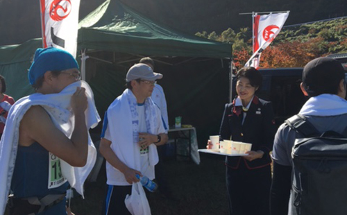 東北復興を応援するJALは、地元住民や高校生ボランティアの声援がランナーを支える「湯のまち飯坂・茂庭っ湖マラソン」に2017年大会から特別協賛し、まちの活性化を応援しています。協賛開始の2017年は、元JALグランドサービス陸上部員がマラソンのコースを視察し、コースや運営をアドバイス。大会当日のJALブースでは、機内で提供している飴やジュースを振る舞い、声援を送りながら大会を盛り上げています。