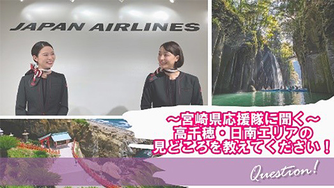 宮崎県にゆかりあるJALふるさと応援隊が登場し、おすすめのエリアや見どころをご紹介します。JALショッピングでお買い求めいただける美味しい特産品もご紹介しておりますので、ぜひJALオンライントリップサイトへお越しいただき、「旅の試着」体験をお楽しみください。