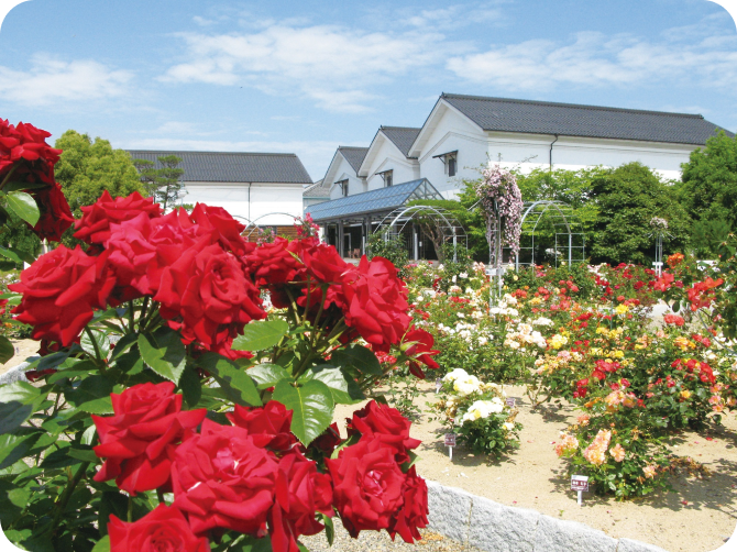中央花壇には綾部ゆかりの「アンネのバラ」を植栽。