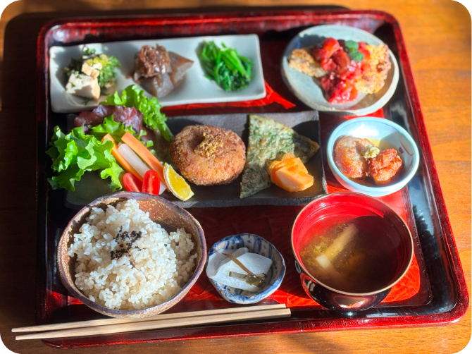 窯で炊いた地元産のお米、平飼い卵、野菜、宮津や舞鶴産の海の幸など、